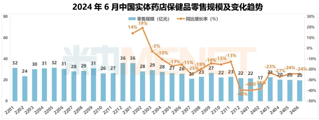 2024年6月,中国实体药店保健品零售规模为20亿元,规模与上月持平;与去年同期相比,仍有24.2%的降幅。2024年1-6月,保健品累计规模为122亿元。