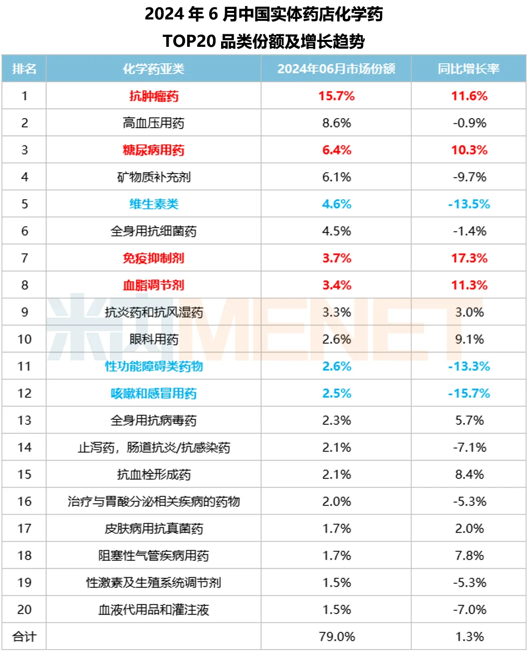2024年6月,化学药TOP20品类销售规模较上月下滑了4.2%,而同比增长了1.3%,份额仍为79%。总的来看,化学药TOP20品类的增速高于药品总体增速。