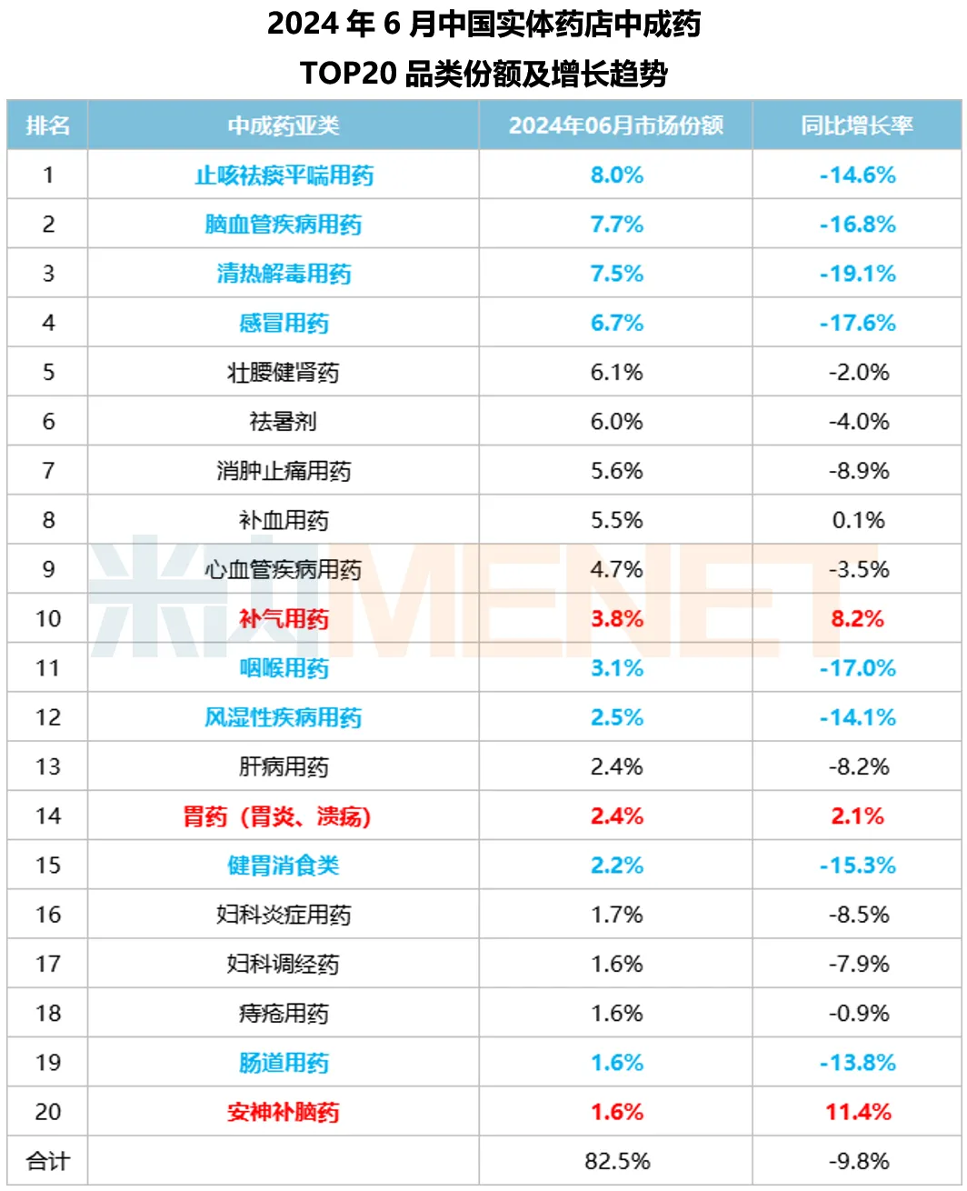 2024年6月,中成药TOP20品类份额为82.5%,销售规模较上月下降了3.2%,与同期相比下降了9.8%,市场对中成药的需求明显减少。