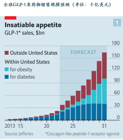 在糖尿病和肥胖护理领域,司美格鲁肽的成功不仅为诺和诺德带来了显著的营收增长,也推动了整个GLP-1药物市场的发展。根据经济学人报道,预计2031年全球GLP-1类药物整体销售规模有望达1650亿美元规模,其中,美国市场规模预计将达近1000亿美元。这一增长趋势反映了GLP-1类药物在全球糖尿病治疗领域占有率的稳步提升,以及在减重等新适应症领域的不断拓展。