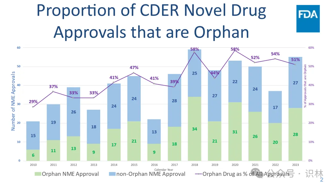 5. FDA 继续看到批准用于治疗罕见病症或疾病的药物的数量和百分比呈上升趋势。