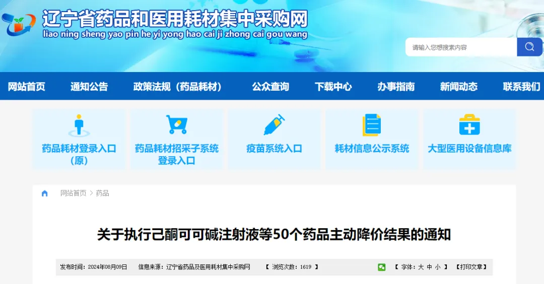 8月9日,辽宁省药品集中采购网发布一则药品降价通知。本次共计50个药品(按品规统计)主动降价,降价产品设置采购过渡期,时间为1周。降价调整工作已于近日完成。