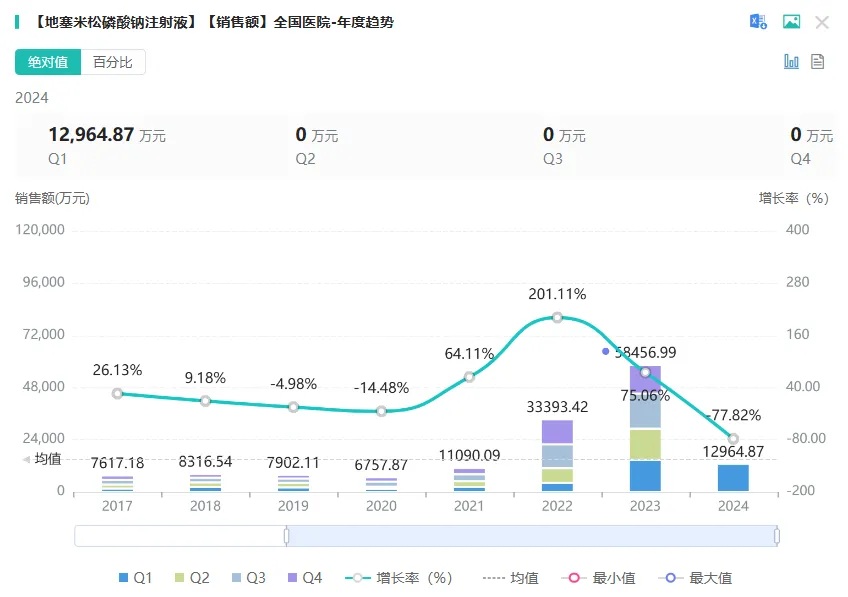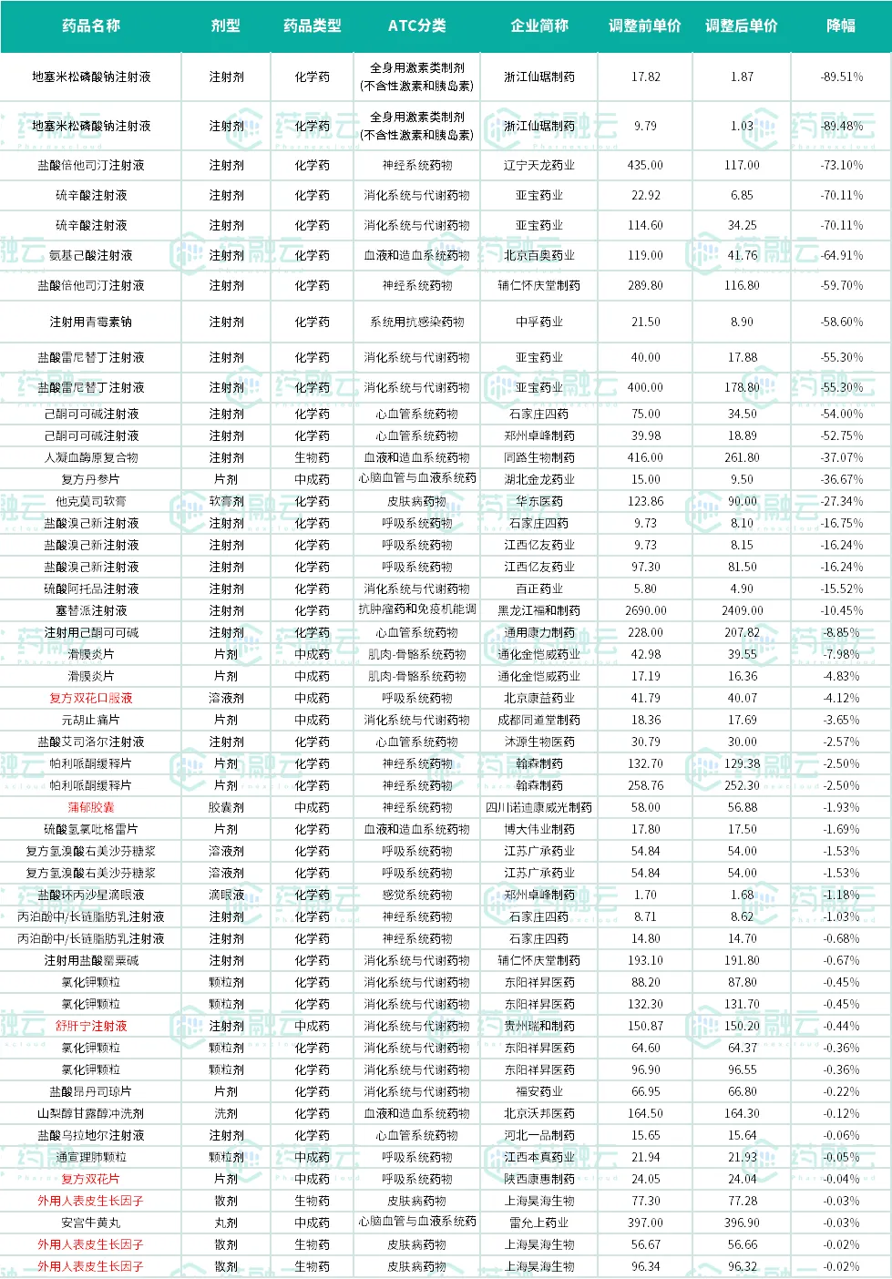 50个药品(按产品品规统计)主动降价,涵盖了化学药、生物药、中成药三大类。从降价幅度来看,其中,外用人表皮生长因子由96.34元下降至96.32元,降幅0.02%,是本次降幅最小的药品。此外,地塞米松磷酸钠注射液由17.82元下降至1.87元,降幅89.51%,是本次降幅最高的药品。据药融云数据库显示,地塞米松磷酸钠注射液在2023年全国院内市场的销售额超5亿元,同比增长达75.06%。