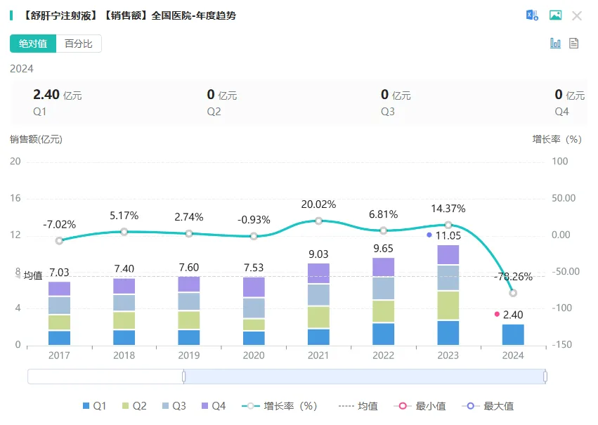此外,舒肝宁注射液是贵州瑞和制药的独家中成药,该药由茵陈提取物、栀子提取物、黄芩苷、板蓝根提取物、灵芝提取物等成分组成,功能主治清热解毒、利湿退黄、益气扶正、保肝护肝,可用于急/慢性病毒性肝炎,是中西医结合治疗肝病的一线用药。据药融云数据库显示,舒肝宁注射液在2023年全国院内市场的销售额超11亿元,同比增长达14.37%。