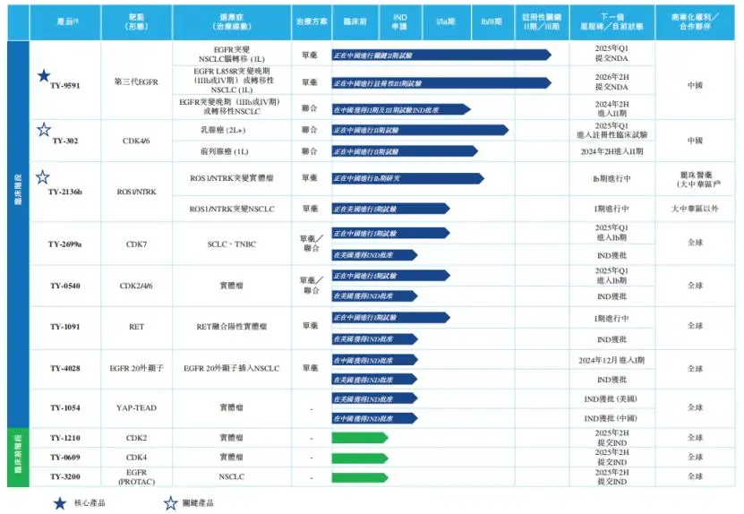 TY-9591是第三代EGFR酪氨酸激酶抑制剂(「TKI」),能够不可逆地结合某些EGFR突变体(包括21外显子L858R突变、19外显子缺失、L858R/T790M突变和19外显子缺失╱T790M突变),从而抑制下游信号级联反应(如Ras/Raf/MEK/ERK或磷酸肌醇3-激酶(「PI3K」)/蛋白激酶B(「AKT」)通路),最终抑制癌细胞的增殖和转移。