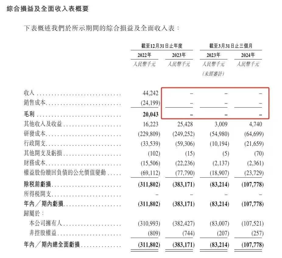 招股书显示,没有成熟产品支撑的同源康医药,2022年、2023年及2024年一季度,总全面亏损分别为3.1亿元、3.8亿元及1.1亿元,也就是说,近几年合计亏损8亿元。