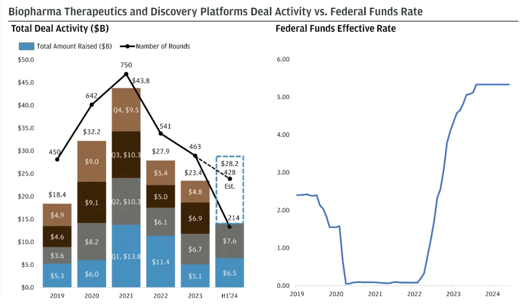 2024年第二季度,美国生物制药行业有107起融资事件,融资总额达76亿美元。前两个季度,对生物制药(biopharma therapeutics)和平台型公司的投资总额均环比增长。摩根大通预测,今年9月降息后,生物制药交易和融资活动会在下半年有所增长,预计全年将达到282亿美元,有望打破两年来的下降趋势。