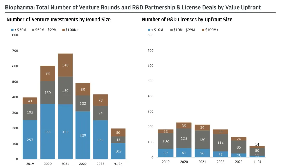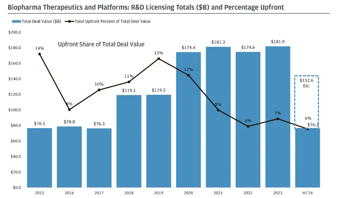 2024年上半年,美国生物制药领域已经披露763亿美元的许可交易,其中仅6%为预付款,而2019年的峰值为13%。