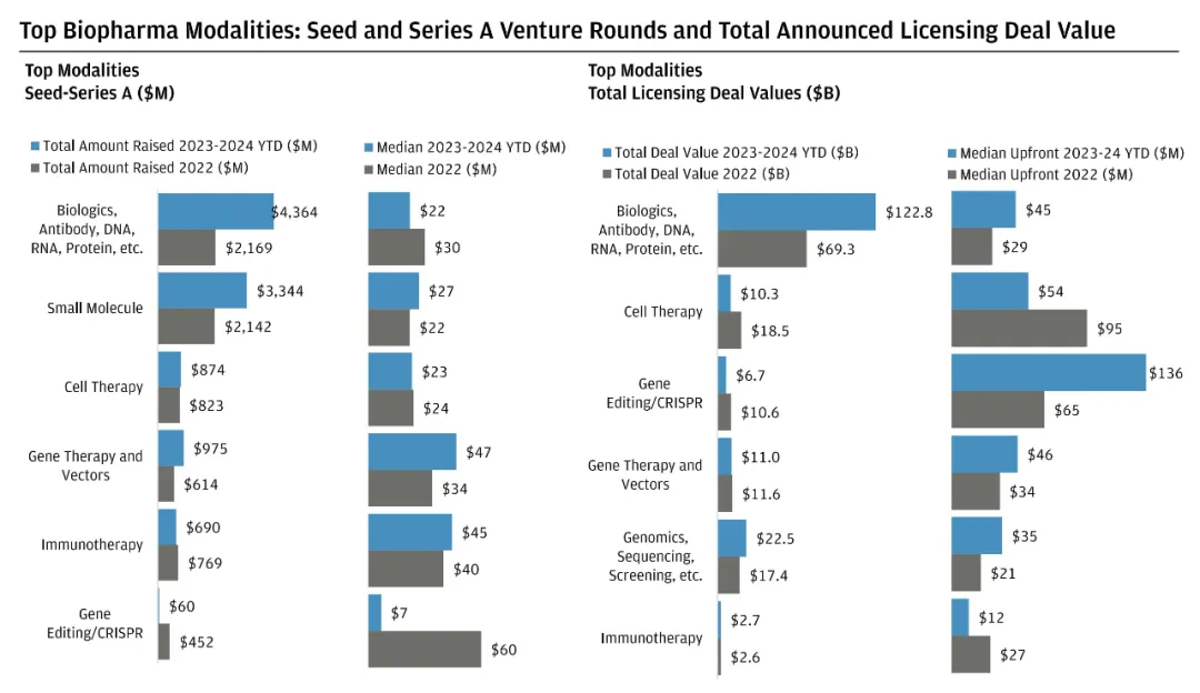 2023年至2024年上半年,生物制剂的早期投资(种子轮~A轮)和许可交易预付款持续增加。过去一年半,生物制剂的早期投资总额达44亿美元,融资额中位数为2,200万美元,相关许可交易总额达1,228亿美元,预付款中位数为4,500万美元。
