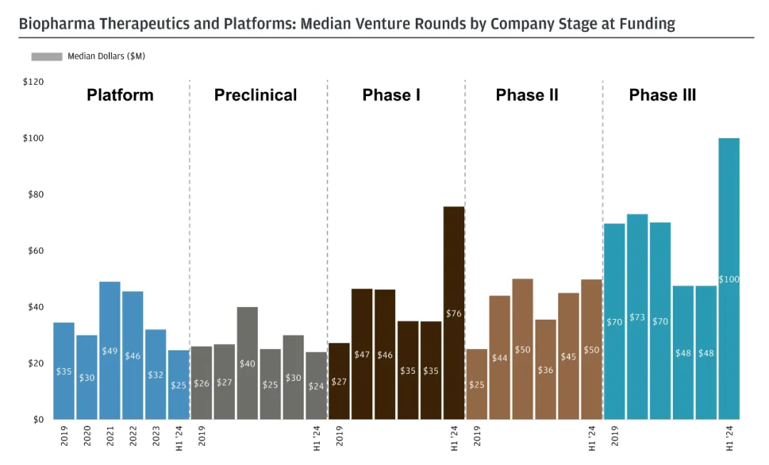 从开发阶段来看,报告显示,2024年上半年,处于临床I期至临床III期的生物制药公司的投资额中位数最高,且都是2023年的两倍多;而平台型公司和临床前公司的投资额中位数比往年要低。