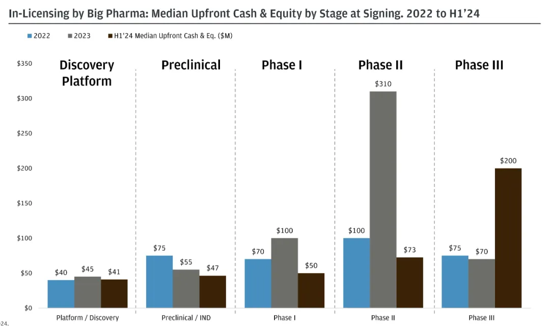 药物资产按照开发阶段的早晚也有了清晰的价格定位。报告显示,2024年上半年,大型制药公司为临床II期项目支付的预付款及股权中位数为7,300万美元,临床I期项目为5,000万美元,临床前/IND项目为4,700万美元,发现平台项目为4,100万美元。