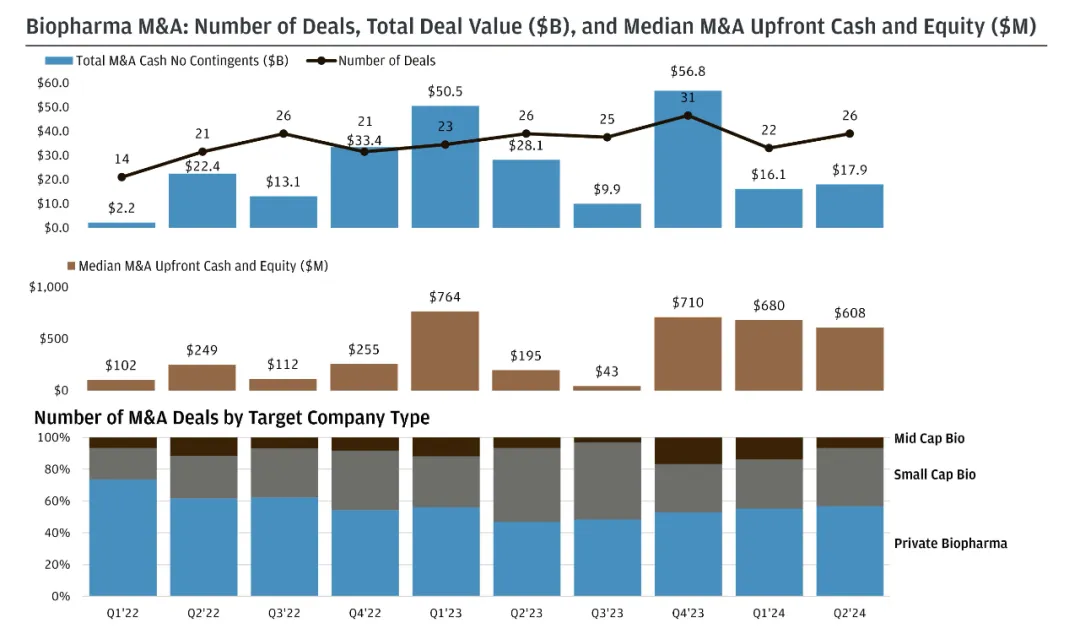 具体来说,26家生物制药公司和平台公司在第二季度宣布了并购交易,交易总额达179亿美元,交易额中位数为6.08亿美元,相较于2023年全年的交易额中位数6.8亿美元有所下降。