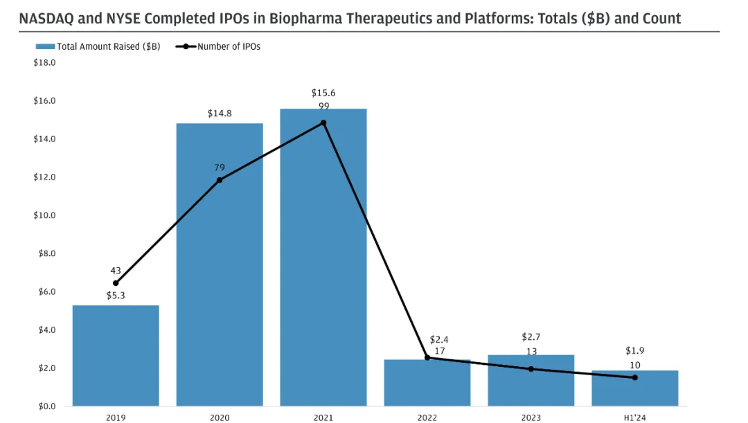 并购风行的另一面,是IPO仍相对低迷。2024年上半年,10家生物制药公司在美国交易所完成IPO,募资资金总额达19亿美元。
