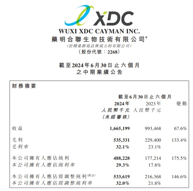 药明合联2024年上半年的中期业绩显示: