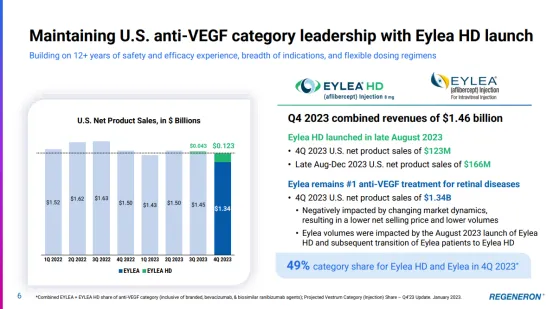 市场竞争并未停歇。根据再生元2023年财报信息,阿柏西普(Eylea)尽管销售额达到了92.15亿美元,却同比下降了4%。面对生物类似药的冲击和竞品的挑战,再生元和拜耳推出了阿柏西普高剂量8mg版本(Eylea HD),成功将治疗间隔从每2个月一次延长到每4个月一次,以期在市场中保持竞争力。