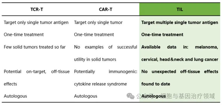 当下,国内外企业研发热度较高且已取得重大临床进展的免疫细胞疗法主要为CAR-T疗法、CAR-NK疗法、TCR-T疗法及TIL(Tumor Infiltrating Lymphocyte Cell,肿瘤浸润淋巴细胞)疗法。其中针对CAR-T疗法的研发最为火热,也已有数款针对血液肿瘤的CAR-T疗法获批上市,但由于实体瘤的特异性抗原少、异质性及肿瘤微环境等,CAR-T疗法在治疗实体瘤方面存在诸多挑战,鉴于TIL疗法在攻克实体瘤方面的优势,此疗法被给予攻克实体瘤的厚望;此外,相比来看,TIL还具有临床副作用小,优异的肿瘤定位能力、制备成本低等优势。