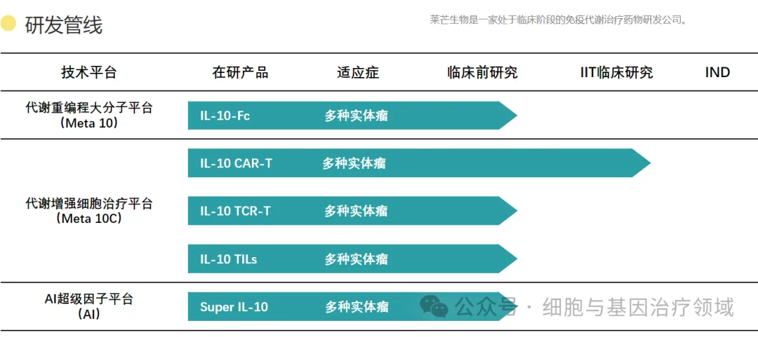 深圳莱芒生物科技有限公司(Leman Biotech Co., Ltd)是一家处于临床阶段的免疫代谢创新药物研发公司,由瑞士洛桑联邦理工学院(EPFL)唐力教授团队联合晶泰科技共同创立。基于免疫代谢重编程+前沿人工智能的创新技术,公司专注于研发、生产和商业化新型肿瘤免疫治疗药物。公司核心技术Meta 10展示出治愈实体肿瘤的巨大潜力,相关成果发表于国际顶级学术期刊Nature Immunology、Nature Biotechnology,并申请了2项PCT专利(已覆盖全球主要经济体)和2项中国专利。目前公司发展迅速,70%高层次研发人员来自国内外名校并具有丰富的产业化经验,多条研发管线进展顺利。其中代谢增强型CAR-T细胞治疗正在开展IIT临床研究(NCT05715606, NCT05747157, NCT06120166),20余位患者获得临床治愈。2022年以来,公司获得两轮超亿元天使投资,荣获20余项生物医药领域国家或省市级奖项。