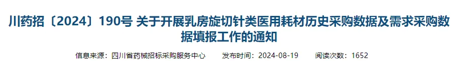 近日,四川、山西、内蒙古等地宣布开展乳房旋切针类医用耗材数据填报等工作,涉及历史采购数据和采购需求量。