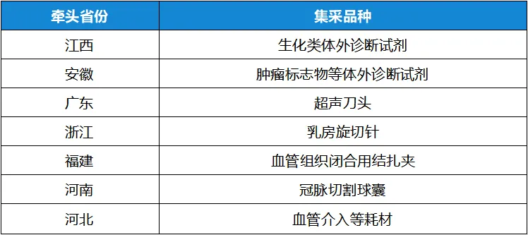 此外,国家医保局提出的各耗材全国联采工作也正密集推动中。日前,福建牵头的血管组织闭合用结扎夹采购工作已公布符合要求的参与带量采购的企业及产品名单,即将开启报量工作;江西牵头的生化类体外诊断试剂采购也已开展品种信息填报工作;河北牵头的血管介入等耗材采购已确定6类产品……