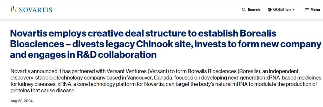 Borealis源自Chinook Therapeutics的成功,诺华和Versant Ventures于2019年创立了Chinook Therapeutics公司,并于去年以32亿美元的预付款收购了该公司,并再出资3亿美元收购其两项治疗免疫球蛋白A 肾病(IgAN)的后期资产。收购完成后,诺华很快认识到 Chinook 在温哥华遗留下来的早期研究人才、场地设施和能力所蕴含的巨大科学潜力,这两家公司又于2024年8月22日合作创建了另一家类似模式的公司Borealis Biosciences,该公司将致力于发现治疗肾脏疾病的新一代xRNA药物,旨在利用最近的行业突破,例如“更好地了解患者分层、基因定义的目标、向特定肾脏细胞类型输送治疗有效载荷的要求以及RNA化学进展”。