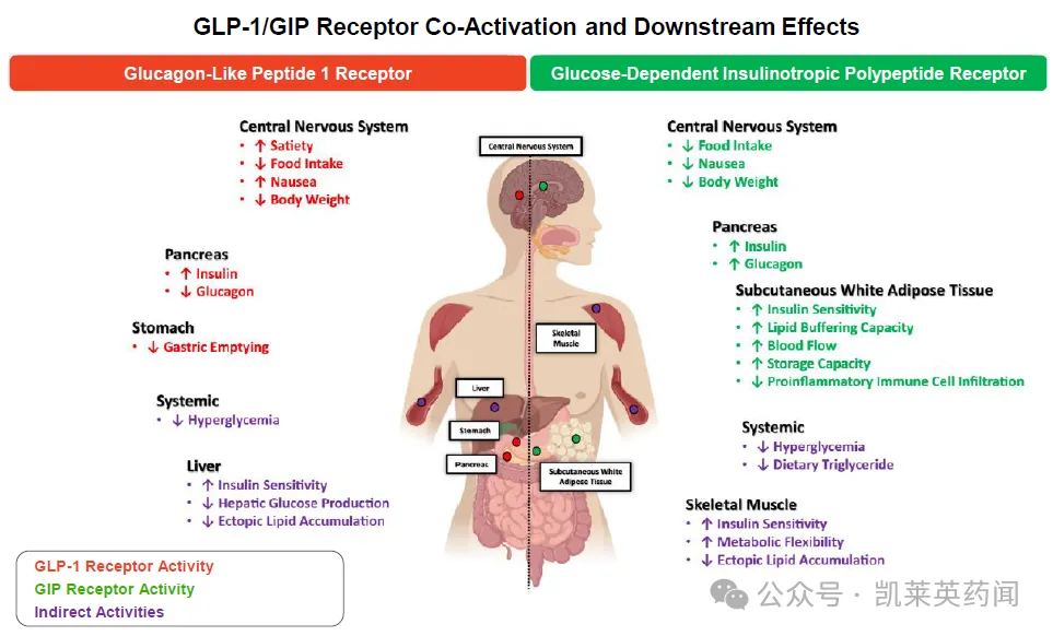与单一GLP-1RA相比,多靶点药物的开发将提供更大的治疗潜力。新的开发方向致力于将GLP-1RA与涉及能量和营养方面的其他治疗路径相结合,如与葡萄糖依赖的GIP、调节能量代谢的胰高血糖素(GCG)等相结合发挥协同作用。
