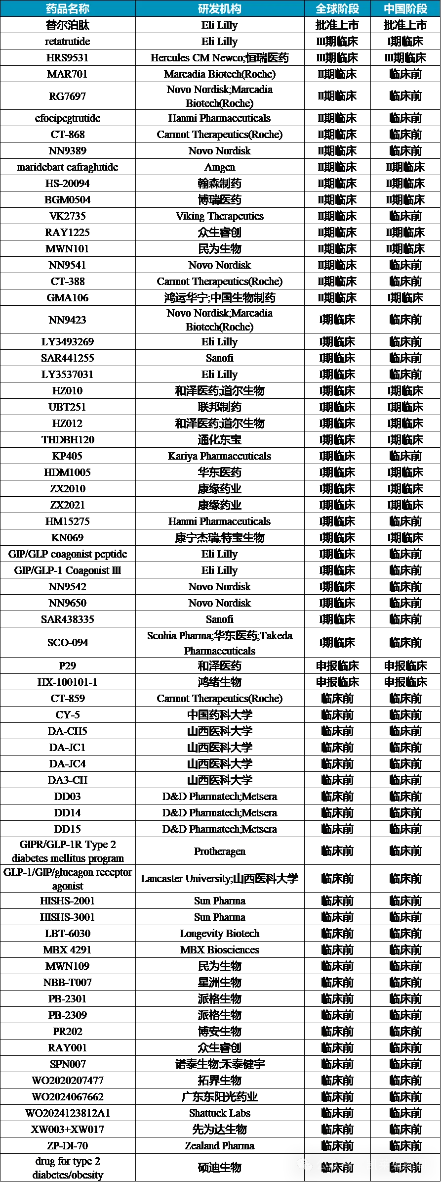 据不完全统计,目前在研的涉及GLP-1/GIP受体的治疗药物超60余种,仅替尔泊肽一款药物获批,除双靶点外还包括三靶点以及多靶点药物。在国内布局来看,恒瑞医药、翰森制药、博瑞医药、众生睿创、民为生物、鸿运生物/中国生物制药等产品进展较快。