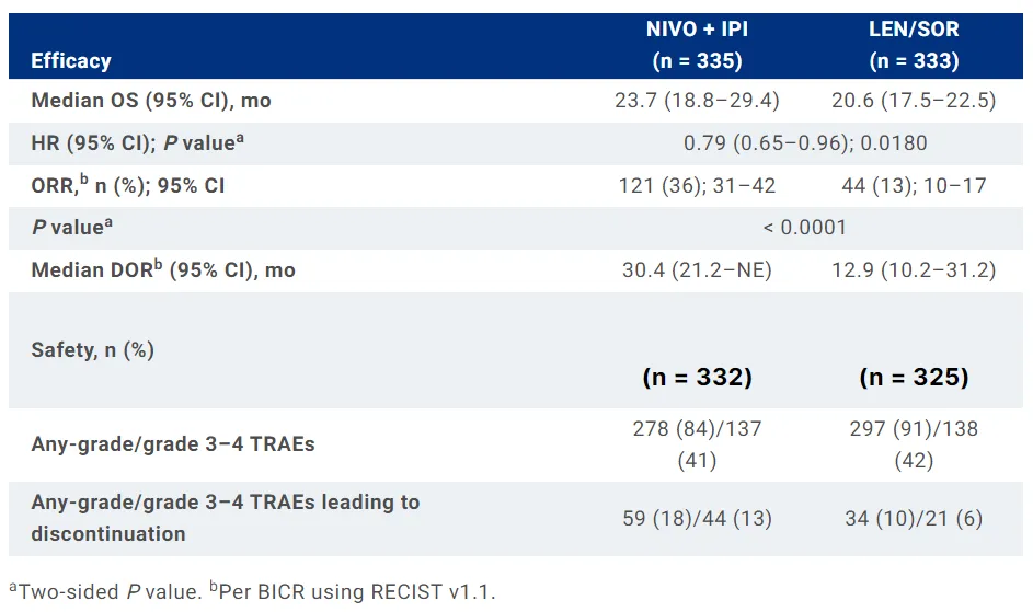 Opdivo加Yervoy联合疗法组的完全缓解(CR)率更高,达7%,而活性对照药物组患者的CR仅为2%。此外,患者展现持久缓解。在达成缓解的患者中,Opdivo加Yervoy联合疗法组的中位缓解持续时间为30.4个月(95% CI:21.2-NE),而活性对照药物组的中位缓解持续时间为12.9个月(95% CI:10.2-31.2)。
