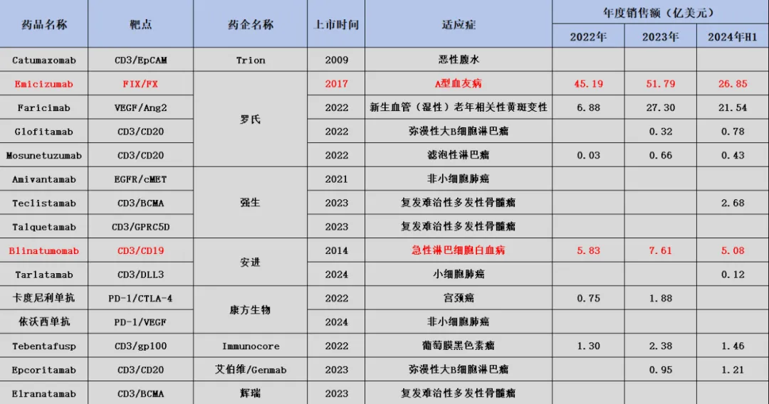 受限于首款双抗药物孱弱的市场表现,动摇了药企在双抗赛道中的信心。至2020年之前,全球也仅有两款双抗药物上市,分别是2014年上市的Blinatumomab和2017年上市的Emicizumab。