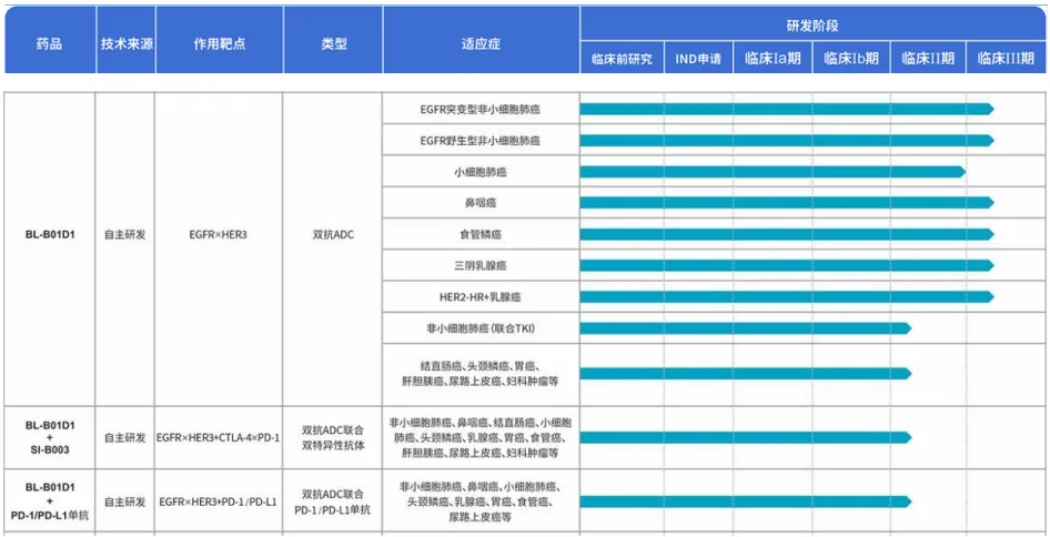在双抗的赛道上,百利天恒不仅从双抗升级到多抗,且与ADC融合开发双抗ADC,在临床开发上,又进行双抗ADC(BL-B01D1)和双抗(SI-B003)用于多种癌症的临床试验,堪称最具备想象空间的选手。