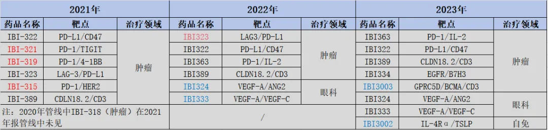 尤其是这些年信达生物在双抗上的布局,略显浮躁。对比2021年以来年报中临床管线规划,不难看出信达生物在双抗布局上的彷徨。2021年报显示,信达共有6款双抗管线;而2022年报中,IBI-321、IBI-319和IBI-315消失不见;2023年报中,之前的IBI-323又消失不见。