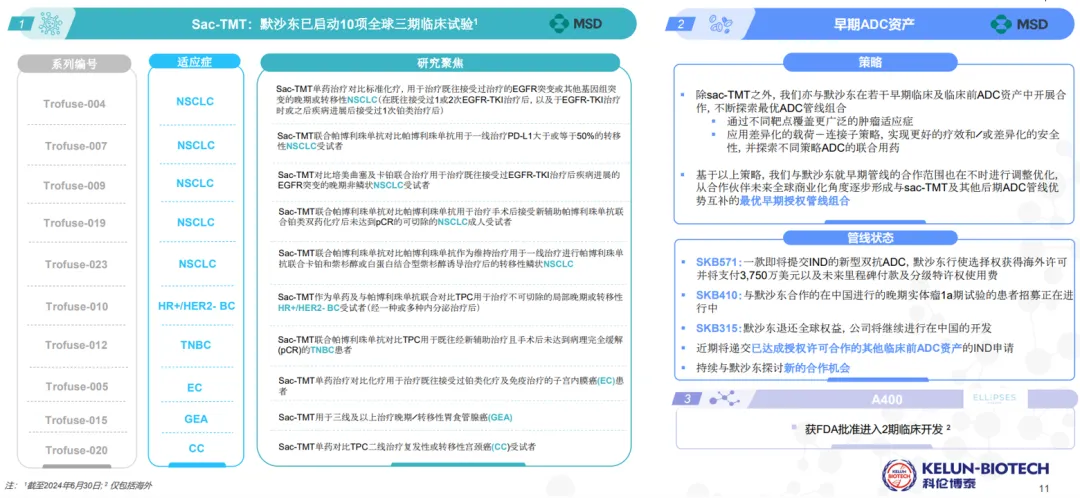 2022年,科伦博泰共与默沙东达成3项总额超百亿美元的交易,使得科伦博泰成为首家与前十大生物制药跨国公司建立ADC合作的中国公司,并且诞生了迄今为止由中国公司获得的最大生物制药对外许可交易(指与默沙东合作开发多项临床前ADC资产数额)。除默沙东外,科伦博泰近年还与和铂医药、Ellipses Pharma等公司达成多项合作。