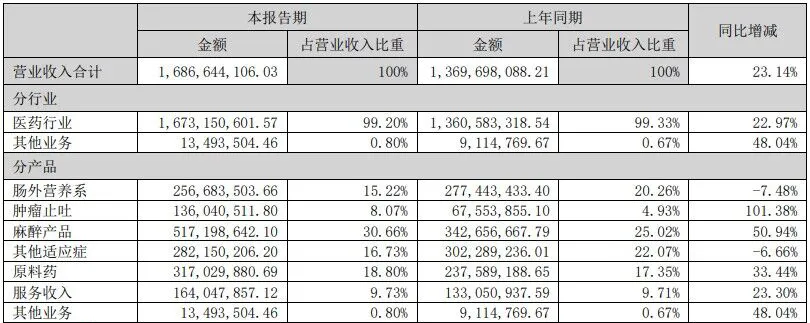 2024年上半年海思科麻醉产品收入5.17亿元,同比增长50.94%,占营业收入的30.66%;肠外营养系产品收入2.57亿元,同比下降7.48%,占营业收入的15.22%;肿瘤止吐产品收入1.36亿元,同比增长101.38%,占营业收入的8.07%。