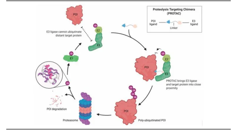 蛋白水解靶向嵌合体(PROTAC)是小分子异双功能降解剂,由两个通过连接子连接的配体组成。其中一个配体负责吸收和结合目标靶蛋白(POI),而另一个配体结合E3泛素连接酶。PROTAC分子将POI与E3连接酶连接,形成三元配合物,诱导E3连接酶将靶蛋白泛素化并启动降解过程。