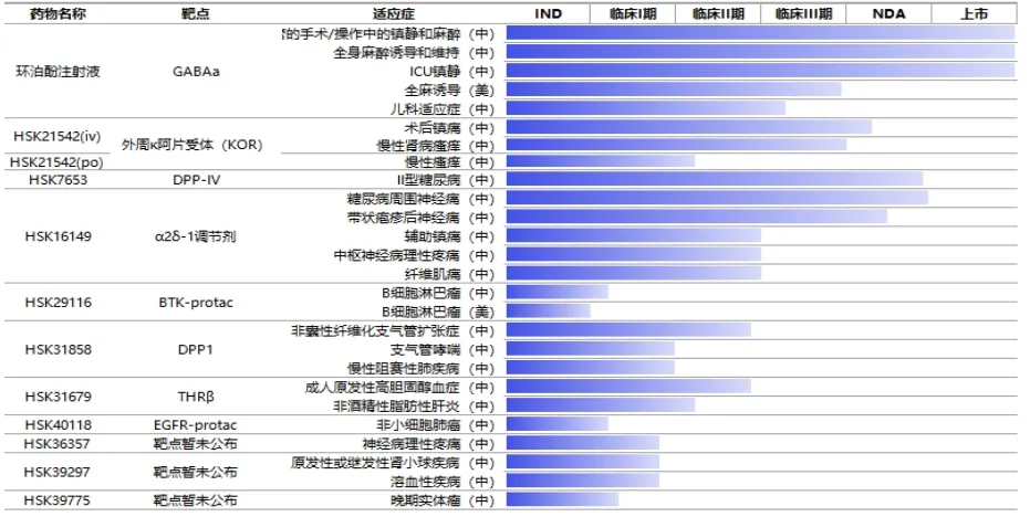 创新药方面,共有12个产品进入临床阶段。其中环泊酚注射液已获批三项适应症,“全麻诱导”适应症的美国Ⅲ期临床工作顺利推进中;神经痛药物HSK16149胶囊,“糖尿病性周围神经病理性疼痛”适应症于2024年5月20日获批上市,“带状疱疹后神经痛”适应症已于2023年9月申报NDA;长效DPP-4抑制剂HSK7653片,于2024年6月获批2型糖尿病适应症。