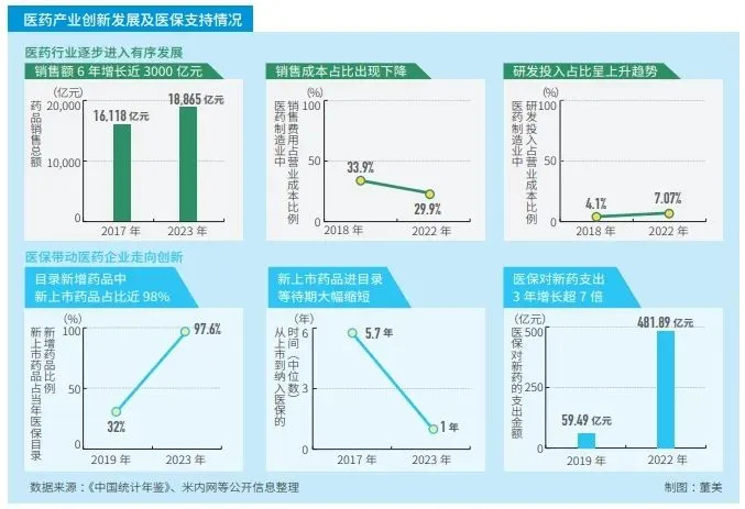 药品价格的虚高导致大量医保资金被动用于对“带金销售”成本的支付上。2018年国家医保局成立后开展的药品集中带量采购政策的主旨,就是要通过集中带量采购,使虚高费用回归真实水平,扭转过分依赖“带金销售”的行业发展格局,推动医药产业实现高质量发展。从政策效果看,2023年《中国统计年鉴》显示,宏观统计上,医药制造业营业成本中销售费用占比近几年出现了下降趋势,从2018年(33.9%)到2022年(29.9%)下降了4个百分点。有学者使用微观企业数据的研究也发现,药品集中带量采购降低了企业的营销支出,企业保持了一定的利润水平,同时企业的药品研发投入显著增加。