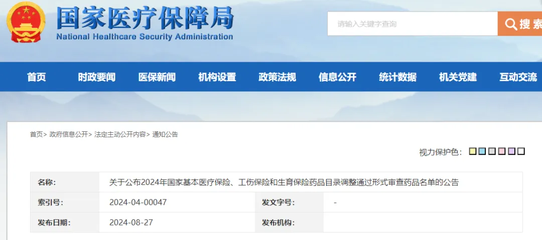 公告称,2024年8月7日至13日,国家医保局向社会公示了《2024年国家基本医疗保险、工伤保险和生育保险药品目录调整通过初步形式审查的申报药品名单》。根据各方反馈意见,国家医保局按程序对有关药品进行了复核和结果修正,现正式公布《2024年国家基本医疗保险、工伤保险和生育保险药品目录调整通过形式审查的申报药品名单》。