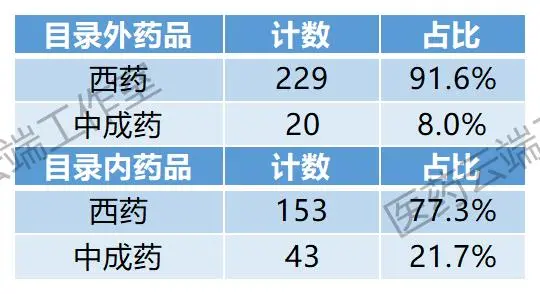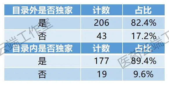 目录外独家品种有206个,占比为82%,其中西药229个,占比超过91%,中成药20个;目录内独家品种有177个,占比超过90%,其中西药153个,占比超过78%,中成药43个。