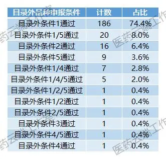 在目录外品种中,通过条件1过形式审查的有186个,占比超过74%,通过条件1/5过审的品种有20个,其余品种中,ton过条件1/4/5过审的品种有7个。