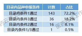 目录内品种中,通过条件1过审的品种有143个,占比超过72%,通过条件3过审的有36个。