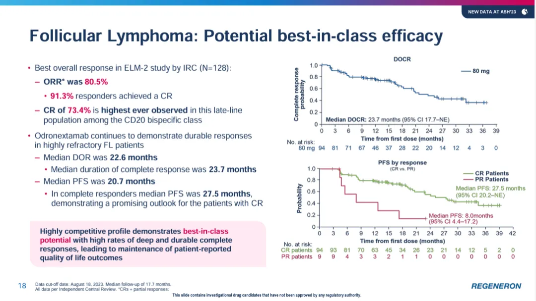 在ELM-2试验中,接受odronextamab治疗的FL患者(n=128)队列的客观缓解率高达80%,完全缓解率为73%,中位缓解持续时间为23个月(95% CI:17-不可估计),中位完全缓解持续时间达24个月(95% CI:18-不可估计)。