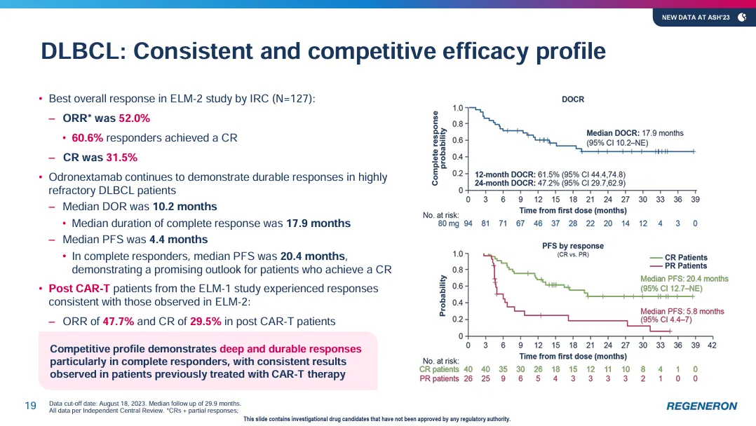 而在ELM-2试验中,接受odronextamab治疗的DLBCL患者(n=127)队列的客观缓解率则为52%,完全缓解率为31%,中位缓解持续时间为10个月(95% CI:5-18),中位完全缓解持续时间为18个月(95% CI:10-不可估计)。