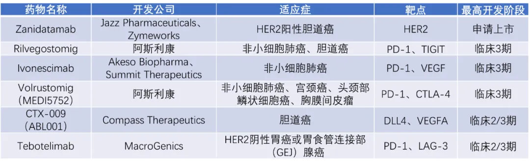 近年来,双特异性抗体逐渐成为癌症治疗的新趋势。目前全球监管单位已批准十余款双特异性抗体用于癌症治疗。目前临床上也有多款疗法处于2/3期试验或以上阶段。其中,由Jazz Pharmaceuticals与Zymeworks共同开发的在研HER2靶向双特异性抗体zanidatamab在用于治疗HER2阳性、局部晚期不可切除或转移性胆道癌(BTC)患者2b期试验中,接受该疗法治疗患者的中位生存期(OS)达15.5个月,这些患者在之前曾接受过吉西他滨治疗。过往数据显示,一线治疗后接受化疗的类似患者群体OS为6个月至9个月。美国FDA已接受zanidatamab的生物制品许可申请(BLA)并授予优先审评资格,该申请的PDUFA目标日期为2024年11月29日。阿斯利康(AstraZeneca)的PD-1和TIGIT靶向rilvegostomig,以及PD-1和CTLA-4靶向volrustomig目前也都处于临床3期试验阶段,用于治疗多种不同类型的癌症。