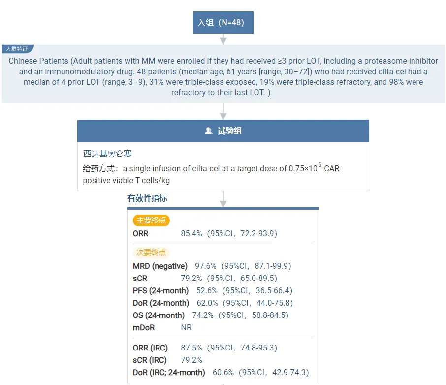 主要研究终点是根据国际骨髓瘤工作组(IMWG)的疗效标准评估 ORR(至少达到 PR 或更佳疗效);次要终点包括严格意义上的完全缓率(sCR)、完全缓解(CR) 、非常好的部分缓解(VGPR)、流式细胞术检测的 10-5 水平微小残留病(MRD)阴性、缓解持续时间(DOR)、无进展生存期(PFS)、总生存期(OS)以及不良事件 (AE) 的发生率和严重程度。