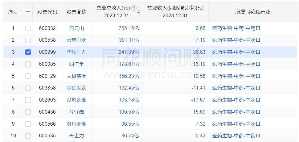 2023年中药上市公司总营收TOP10 图片来源:同花顺问财
