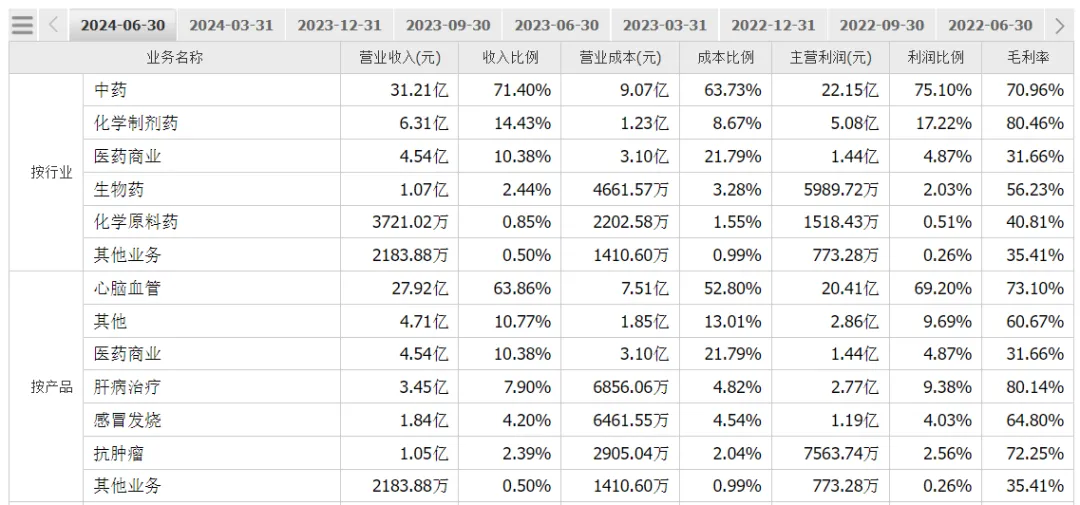 2024年上半年天士力的产品收入结构 图片来源:同花顺财经