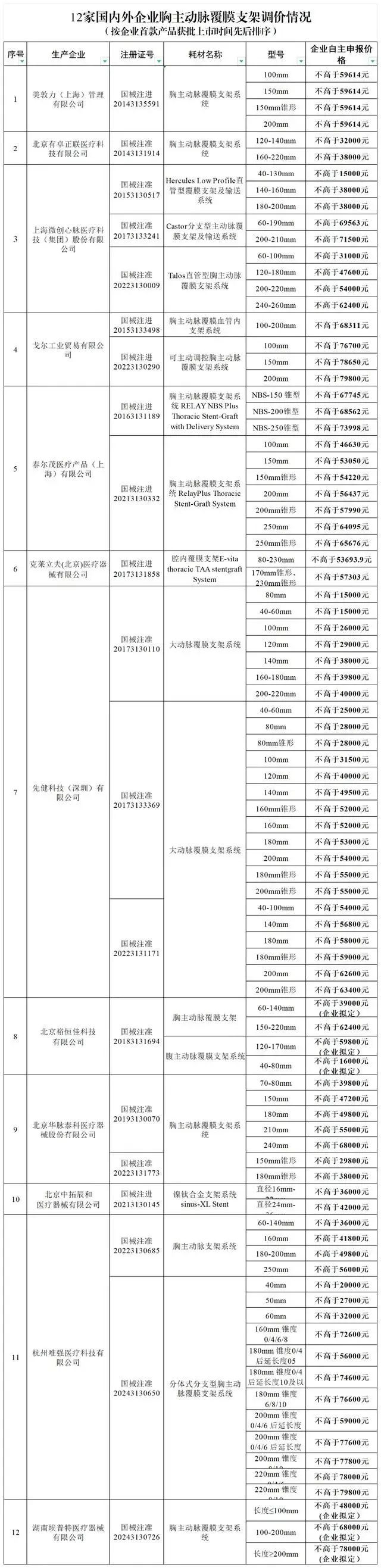 8月26日,国家医保局公布了12家国内外医疗器械公司自主申报的胸主动脉覆膜支架最新终端挂网价格。
