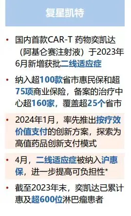 复星凯特主要从事肿瘤免疫细胞治疗产品的研发、生产和商业化。其首款 CAT-T细胞治疗产品奕凯达(阿基仑赛注射液)于 2021 年 6 月获批在中国境内(不包括港澳台地区,下同)上市,成为国内首个获批上市的 CAR-T 细胞治疗产品。