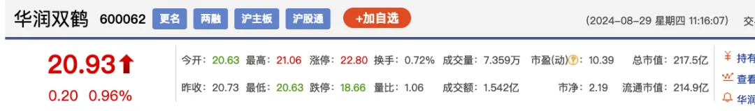 华润双鹤;https://quote.eastmoney.com/sh600062.html;