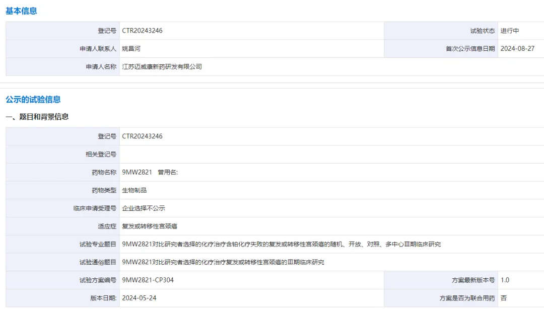 近日,CDE 官网显示,迈威生物启动了一项 9MW2821 的关键 III 期临床研究,治疗含铂化疗失败的复发或转移性宫颈癌。这也是全球首款在宫颈癌适应症进入 III 期临床研究的 Nectin-4 ADC。