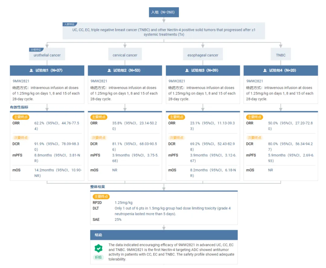 在 2024 年 ASCO 大会上,迈威生物公布了 9MW2821 在多种晚期实体肿瘤患者中初步抗肿瘤活性。这是一项 I/II 期临床研究,其中在宫颈癌队列中,Nectin-4 阳性表达的检出率为 91.87%,Nectin-4 3+ 检出率为 73.98%。53 名可评估疗效的患者中,受试者既往均接受过含铂双药化疗,51% 受试者既往接受过贝伐珠单抗治疗,58% 受试者既往接受过免疫检查点抑制剂治疗。ORR 和 DCR 分别为 35.8% 和 81.1% ,中位 PFS 为 3.9 个月、中位 DOR 为 7.2 个月,总生存期(OS)尚未达到,12 个月的 OS 率为 74.6%。在 Nectin-4 3+ 的患者中,ORR 为 43.6%。上述研究结果表明,9MW2821 在宫颈癌患者中具有积极的治疗效果。